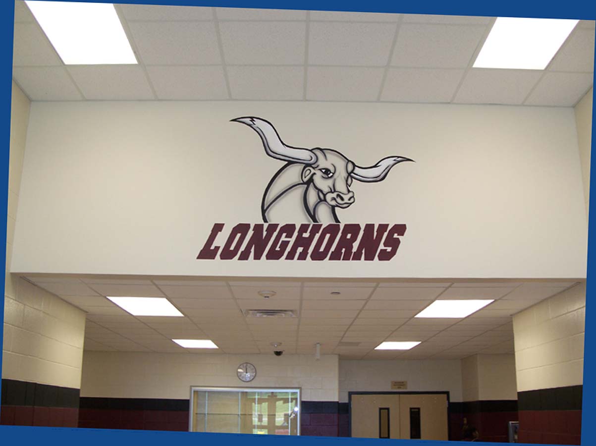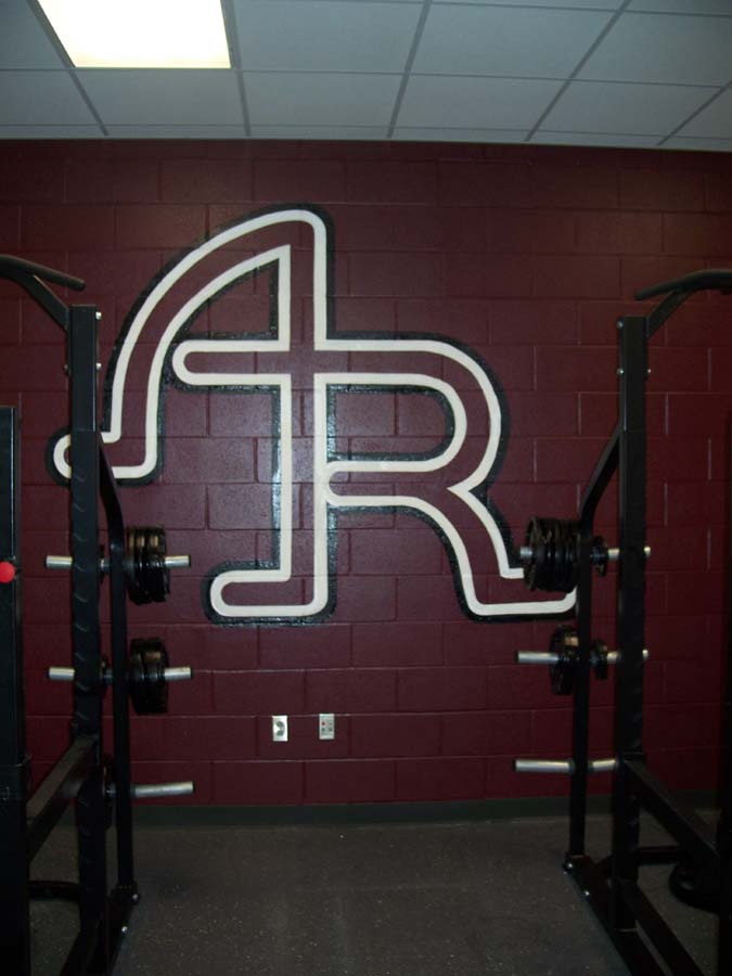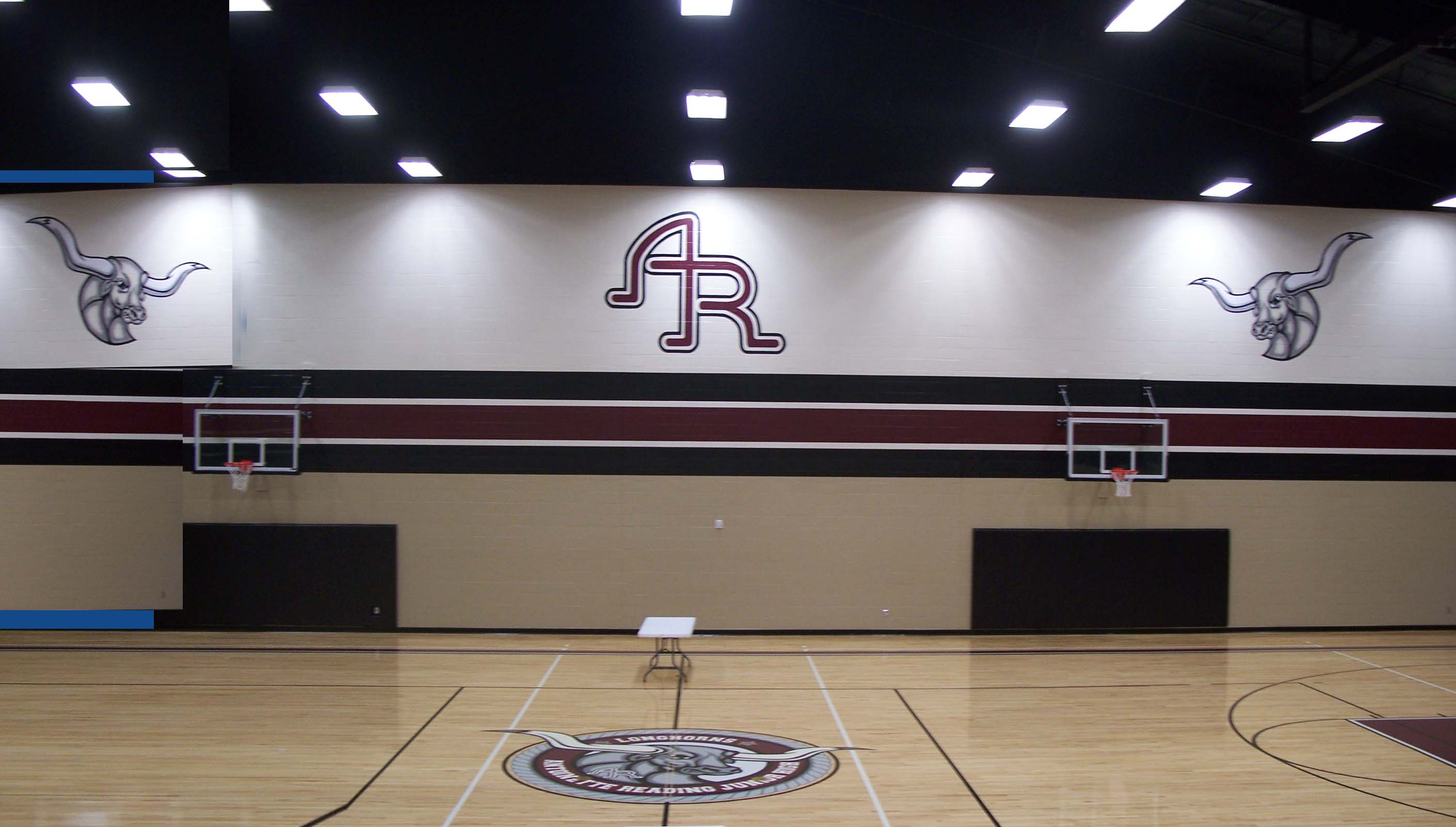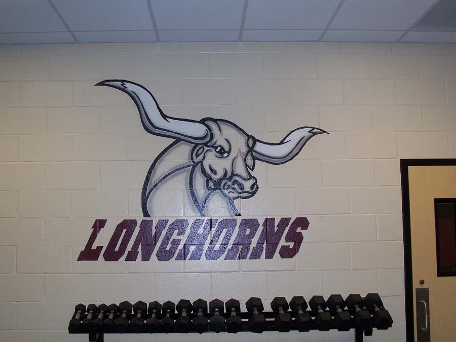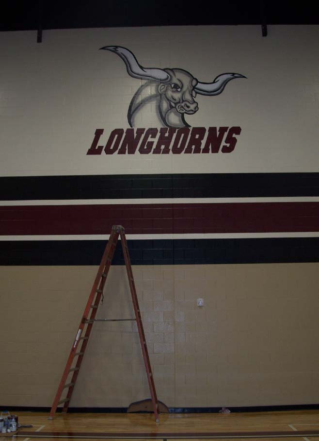 [A] Above: The main gym consisted of the AR logo center, and two large longhorn logos on the sides. The AR logo graphic is approximately 10 feet tall and 8 Ft. wide. They are about twenty feet high on the wall. The longhorns are around the same size. Note: The Longhorn logos were airbrushed around the edges to give them a unique soft look.